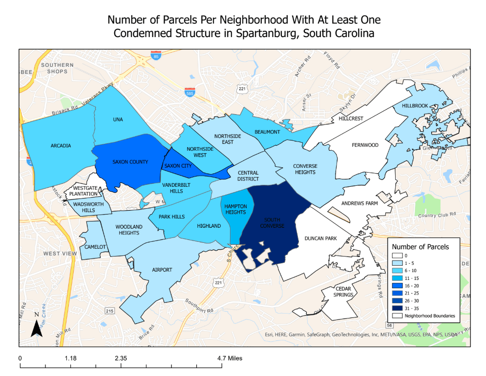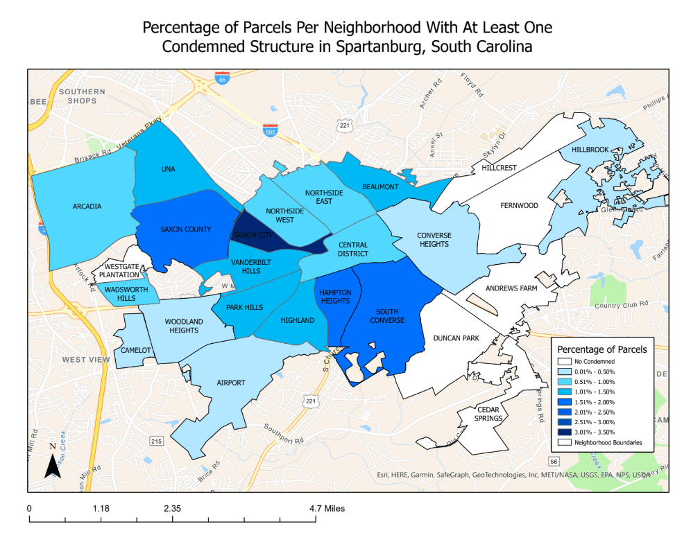 The guiding question of our study was to find if there is an unequal distribution of abandoned and condemned homes in the Una, Saxon, and Arcadia neighborhoods in Spartanburg, SC.